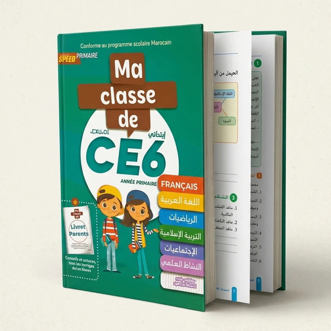 الكتاب الرئيسي "Ma Classe de CE6": الشامل في جميع المواد (العربية، الفرنسية، الرياضيات، التربية الإسلامية، الاجتماعيات، والنشاط العلمي). ملخصات ذكية كتركز على "المفيد" اللي كيتحط في الامتحانات.